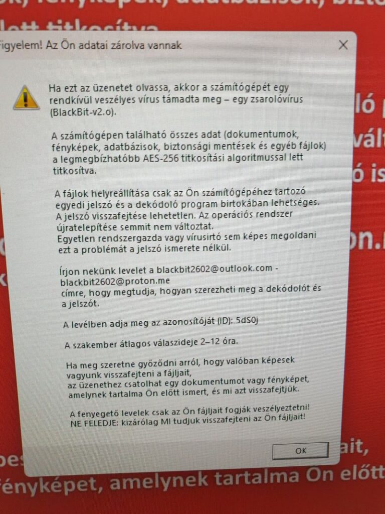 A levél egy olyan linket tartalmaz, amely első ránézésre hivatalos oldalra mutatónak tűnhet, valójában azonban megtévesztő domainre vezet. Ezen az oldalon a címzettet további kattintásra ösztönzik, amelynek eredményeként elindul a zárolás. A zsarolóprogram a titkosítás megkezdése után a fájlnevek elé „ZÁROLT_” előtagot helyez, miközben a fájl kiterjesztése változatlan maradhat. A fertőzéshez kapcsolódó váltságdíj üzenet magyar nyelven jelenik meg, és több esetben a „BlackBit-v2.0” megnevezés szerepel benne.