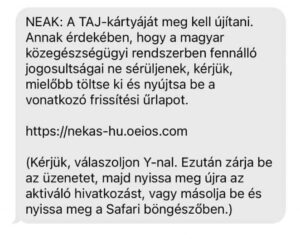 A folyamat egy SMS üzenettel indul, amely látszólag a NEAK-tól érkezik. Az üzenet arra figyelmeztet, hogy a TAJ-kártyát meg kell újítani, és a jogosultságok elvesztésével fenyeget. Egy linket is tartalmaz, amely a felhasználót egy hamis weboldalra irányítja. A gyanús link a nekas-hu[.]oeios[.]com, ami nem a hivatalos NEAK webcím. Az ilyen gyanús domain nevek az adathalász kísérletek tipikus jelei.