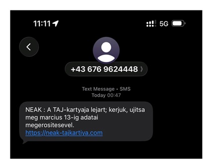 Intézetünkhöz több bejelentés érkezett, amelyek a NEAK-ot megszemélyesítő +436769624448 és +436769624432 osztrák telefonszámokról érkeztek. Az üzenetekben a hxxps://neak-tajkartiya[.]com címre mutató adathalász hivatkozás található.