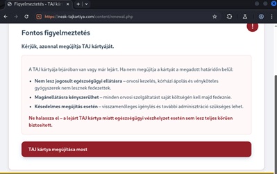 Rövid várakozást követően az alábbi felület jelenik meg, amely a TAJ-kártya megújításának szükségességére hivatkozik, és arra kéri a felhasználót, hogy indítsa el a megújítási folyamatot.