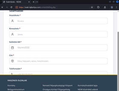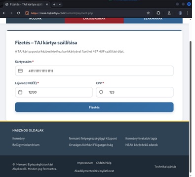 A következő lépésben az oldal bankkártyaadatok megadását kéri a felhasználótól, többek között a bankkártyaszám, a lejárati idő, valamint a CVC-kód megadását, a TAJ-kártya kiszállításának díjára hivatkozva.