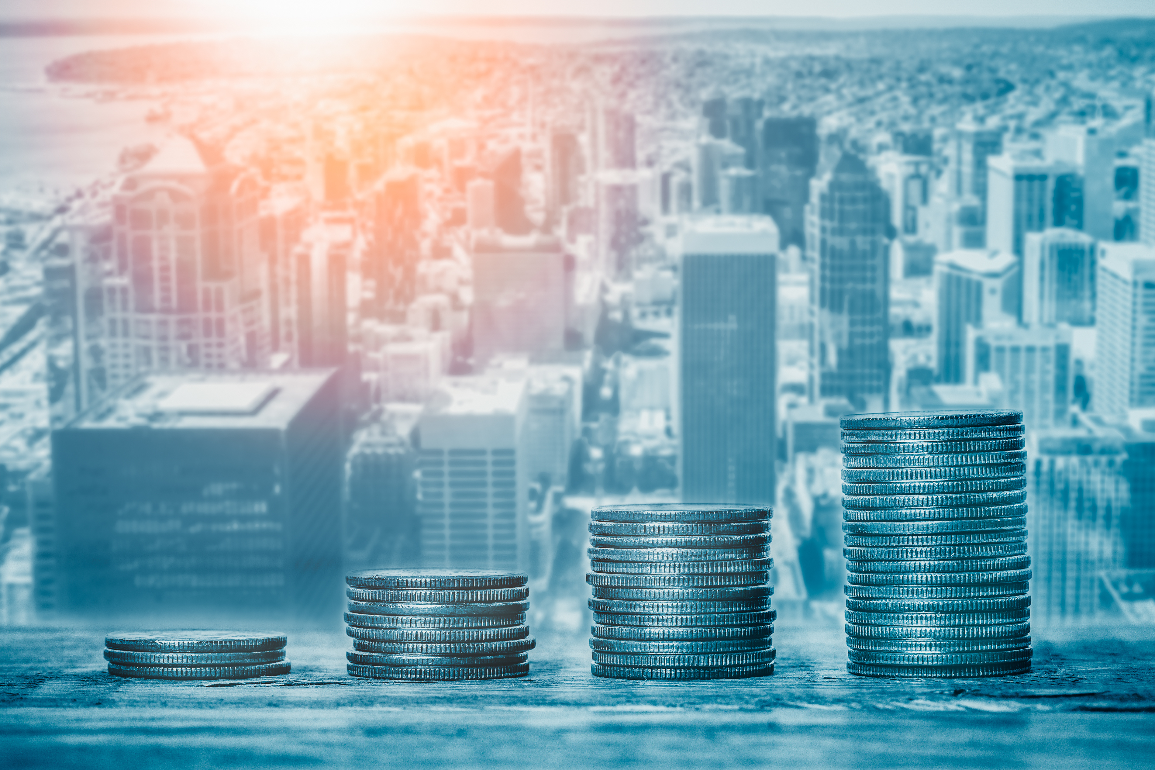 Stacks of coins with cityscape or skyline in the background. Financial growth, real estate sector prices, municipal budget or city funds, economy or banking concepts.