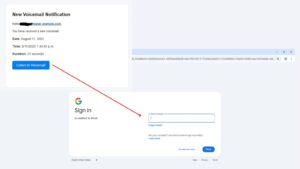 A kampány jellemzően „New Voice Notification” tárgyú e-mailekkel indul, amelyek látszólag megbízható hangüzenet-szolgáltatóktól származnak. Az üzenetekben elhelyezett „Listen to Voicemail” gombok azonban egy kompromittált weboldalakból álló láncolaton vezetik végig a felhasználókat (1. ábra).