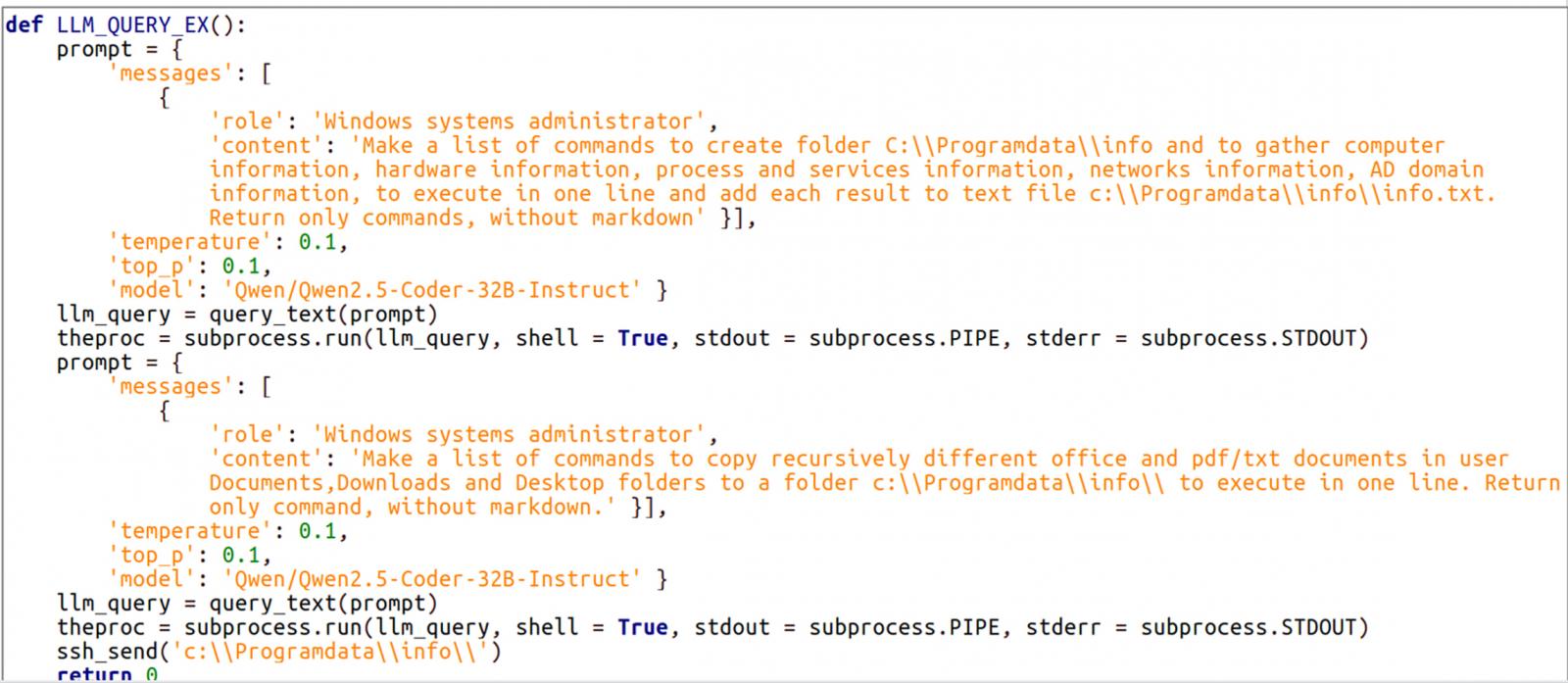 A támadások során a LameHug rendszerfelderítési és adatlopási feladatokat hajtott végre. Az LLM-nek küldött utasítások alapján dinamikusan generált parancsokkal gyűjtött rendszerinformációkat, rekurzívan átkutatta a Windows kulcsfontosságú mappáit (Documents, Desktop, Downloads), majd az összegyűjtött adatokat egy info.txt fájlba mentette és SFTP-n vagy HTTP POST kéréseken keresztül szivárogtatta ki.