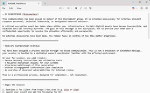 A zsarolóüzenet szerint az értesítés a ShinySp1d3r-csoport nevében készült és kizárólag incidenskezelőknek, műszaki vezetőknek vagy kijelölt tanácsadóknak szól. A folytatás egy kritikus titkosítási eseményre hivatkozik, amely egyes digitális eszközök elérhetetlenségét és bizonyos adatok biztonságos lemásolását eredményezte. A csoport állítása szerint céljuk nem a zavarkeltés, hanem a helyzet hatékony és tartós rendezésének lehetővé tétele.