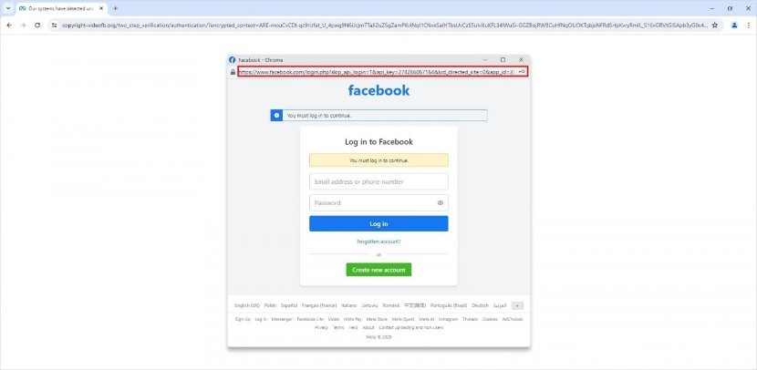 A felismerés elkerülése végett, és azért, hogy még hivatalosabbnak tűnjenek ezek a weboldalak, a csalók gyakran használnak rövidített URL-eket és hamis Meta CAPTCHA oldalakat. A megjelenő felugró ablakban végül az áldozatoknak meg kell adniuk a Facebook bejelentkezési adataikat.